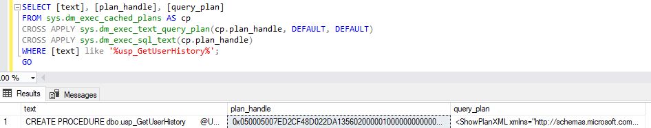 For example, let’s find the plan for the usp_GetUserHistory stored procedure because it is having performance issues. We could run this script to see the query text, plan handle, and query plan: