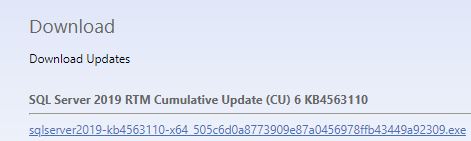 To find and download CU6, we can navigate to https://www.catalog.update.microsoft.com/Home.aspx and search for SQL Server 2019 updates.
