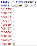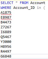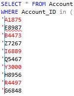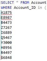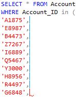 Let’s say someone comes to us with a list of Account_ID values that need to be searched. If we’re going to search the Account table, we need to wrap single quotes and add a comma between each value. This isn’t too big of a deal if there are only a few ID’s that need searched because we can quickly add those characters in manually and run a query. If there are dozens or hundreds of values to add, that isn’t something that be done as quickly. This is where Tip #3, Vertical Select Mode, comes in.