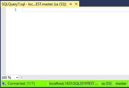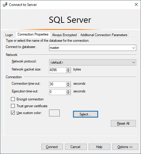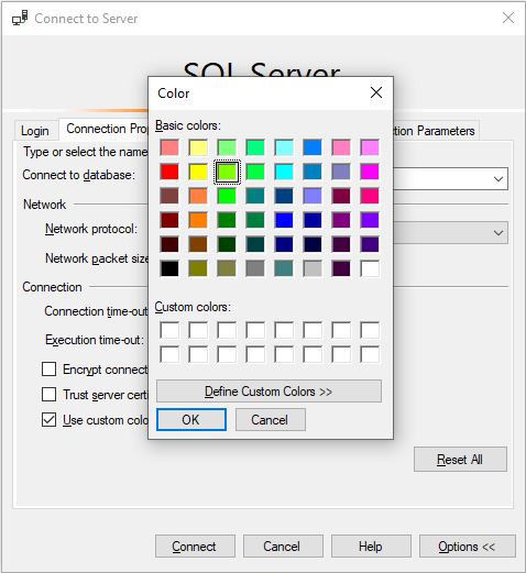 If you click the Select button and choose a color, the chosen color will be associated with the SQL server when logging in and opening a query window. Let’s choose green for this test server.