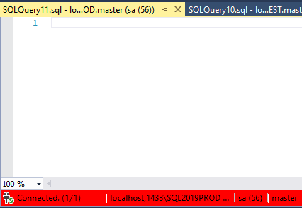 Tip #1 is something extra to help protect you from accidentally running a script or making a change in production instead of a test environment. SSMS has the ability to configure a color at the bottom of a query window indicating what server is currently connected. If you configure any test server connections as green then you can relax a bit when running scripts and see a green highlight across the bottom of the window. If you have your setup configured where production servers show red, you’ll have an extra visual indicator to make you think twice before making a change that can affect production. Let’s setup an example.
