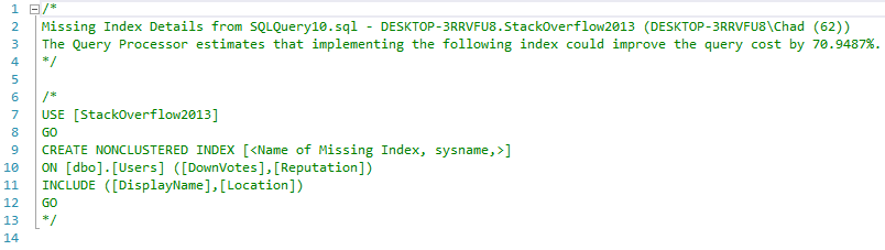 We can right click on green Missing Index text and select Missing Index Details to open the script in a new query window to apply: