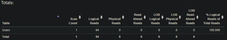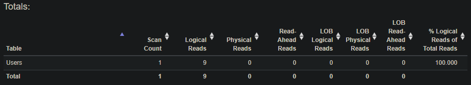 And there were only 9 logical reads! For this example, the totals are small either way. If more data was involved though, that 10x difference in logical reads could be significant.