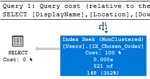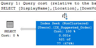 With the suggested index in place, we are down to only 94 logical reads which is great. But what if we created the index with the Reputation and DownVotes columns switched: