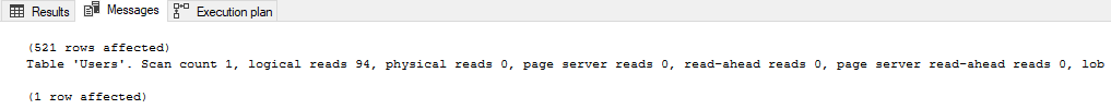 If we run SET STATISTICS IO ON and run the query, we can check the Messages tab to get more information on disk activity when the query runs: