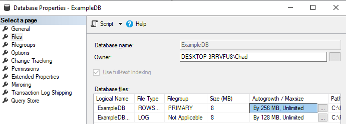 Today, I want to discuss autogrowth in SQL Server. When creating a new database, SQL Server sets default values for autogrowth to handle sizing of the database files as they grow over time. As of SQL Server 2016, these defaults come from the values set in the model database. Unfortunately, these defaults are going to be terrible for most databases. I’ve most often seen databases with values of 1 MB for data files and 10% for the log file.