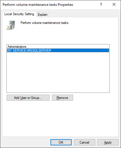 Now that we’ve confirmed IFI is disabled based on the “N” value, let’s get it enabled. To do so, we’ll have to leave the comfort of SSMS and change permissions of the service account running SQL Server.