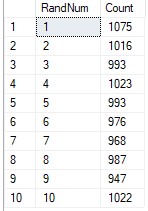 Another option I’ve seen used to get random numbers is the NEWID() function. If we still need a random number between 1 and 10: