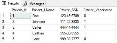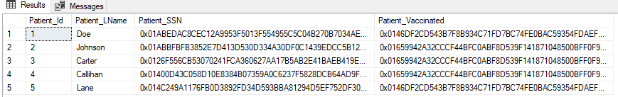 If I know that Callihan was vaccinated, I can determine that Johnson and Carter are as well since they have the same value. This is a simple example of why deterministic is not the best approach if security is your top priority. If we follow the same steps above and change Patient_Vaccinated to randomized encryption, we’ll see this type of result when running our SELECT statement: