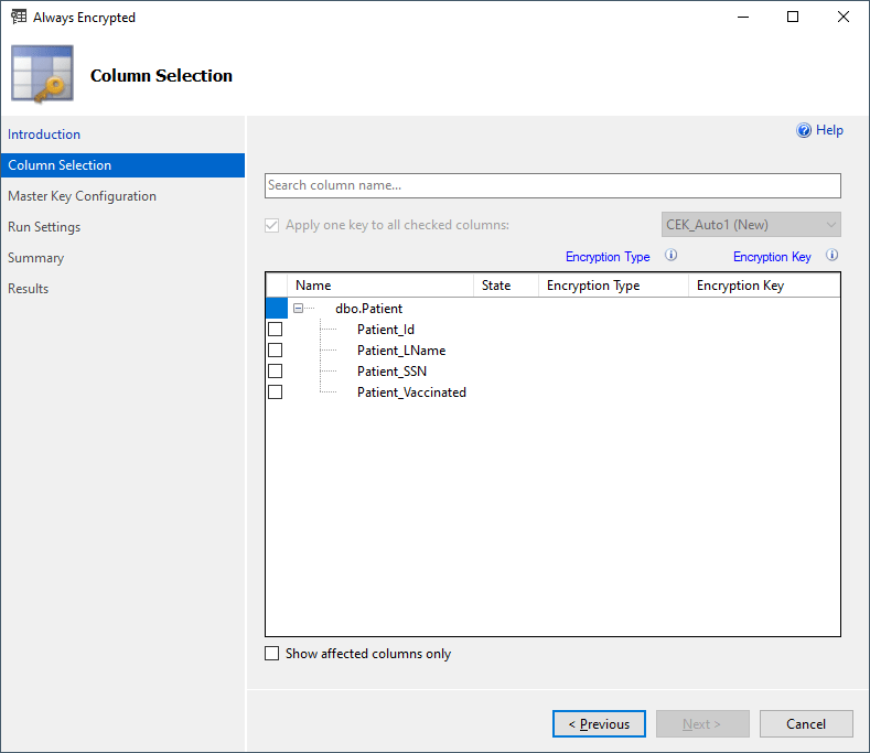 For our example, let’s say we want to encrypt Patient_SSN and Patient_Vaccinated. The first step to setting Always Encrypted is to right click on the table name and select Encrypt Columns: