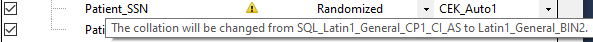 Note the yellow warning we see next to Patient_SSN regarding the column collation change: