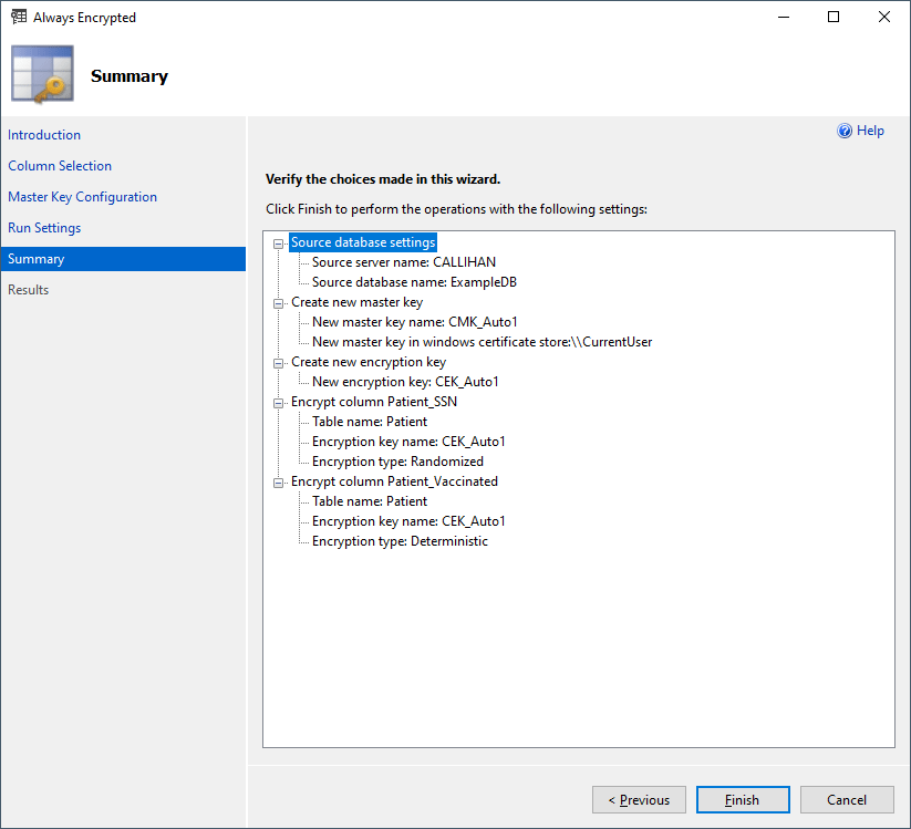 On the Run Settings screen we find that we can save our Always Encrypted setup scripts for later as a Powershell script or we can run them now. We’ll leave Proceed to finish now selected and click Next.