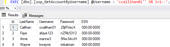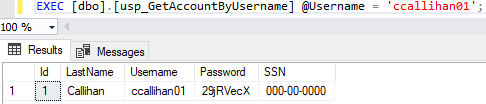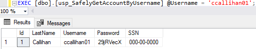 And add a stored procedure to return account information based on the username. I included “PRINT @SQL” for when we want to see what statement is actually being executed.