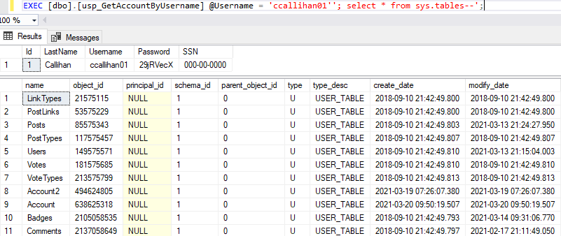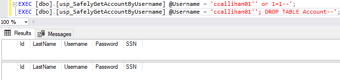 Perhaps even scarier is the ability for data to be dropped altogether. If the following runs to drop the Account table then not even our original stored procedure is going to work because that data is outta here: