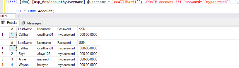 Yep! Updating data to reset all passwords? That works, too. If we run the following and then check our Account table: