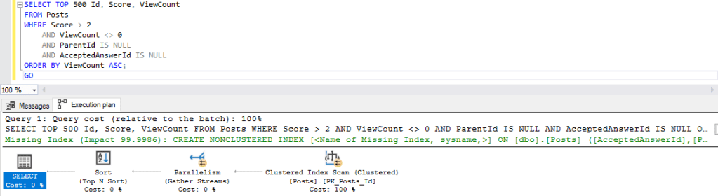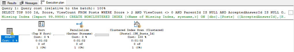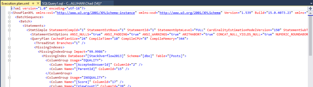 Even with estimated execution plans, you’ll see missing index recommendations for you to consider. To take a look at these recommendations you may want to view the XML format of the execution plan.