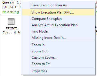 There are a few options if you want to see the plan in XML format instead of icons in the screenshot above. One option is to right click on the execution plan you are viewing and click Show Execution Plan XML.