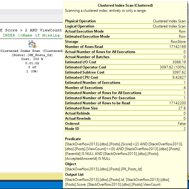 Hovering over the Clustered Index Scan again, we’ll see much more information compared to the estimated execution plan: