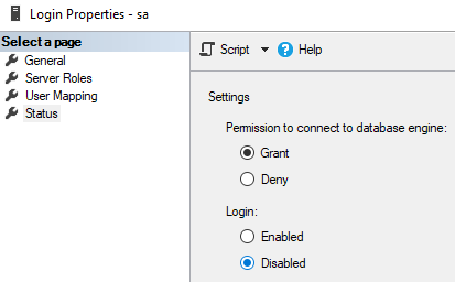 What if you’re in a nice situation where the sa login is not required to be used? Nobody should be logging into a SQL Server sa and applications shouldn’t be using it either (consider the principle of least privilege). If you’re able, disable the sa login. Following the same steps as changing the password, we can instead go to the Status page and make sure the sa login is disabled.