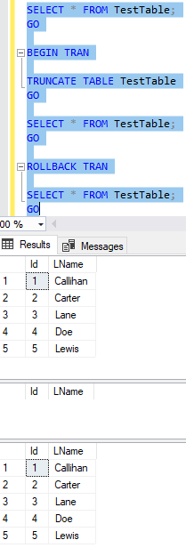 First, we can run a select to view our five records. We can then run our BEGIN TRAN and TRUNCATE to remove data. Running a SELECT again will return no data. But if we roll that transaction back and SELECT again, our original 5 records are back.