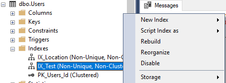 If we’re disabling the IX_Test index on the Users table, we can right click on the index and select Disable: