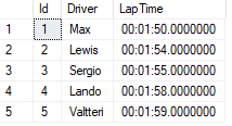 Our example will deal with drivers and race lap times. First, we’ll create a table to hold our lap times and add some test data: