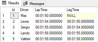 In our example, we see NULL for LagTime in the first row because that is our race leader. We will see his LapTime again on the second row as the LagTime, the second place time on the third row as the LagTime, and so on down the table.