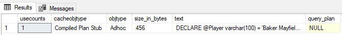 Remember that the query text has to be identical for the plan to be recognized and reused. For instance, running the same SELECT query except for the GO will restart the whole plan stub to compiled plan process for that specific query: