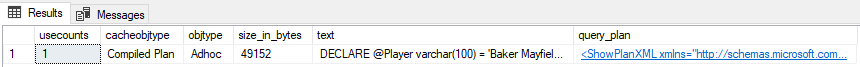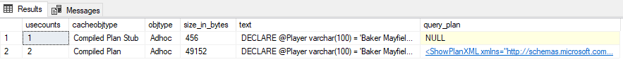 Our cacheobjtype is now Compiled Plan because the plan stub was recognized on the second execution. That leads us to having the query_plan stored and this entry in the plan cache having a size_in_bytes value of 49152 compared to 456.