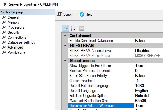If you’d rather enable this option in the SSMS GUI, you can right click on your server in Object Explorer and find Optimize for Ad hoc Workloads on the Advanced Page: