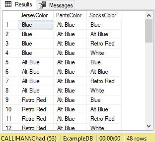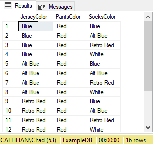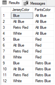 Team jersey and jersey combinations are very important to any sports team. Just as you have that favorite shirt in your closet or maybe even a good luck shirt that you break out for special occasions, so do many teams. I prefer the Alt Blue look for the Columbus Blue Jackets but what if I wanted to see each combination of jerseys and pants? Let’s take a look at how we can accomplish that in SQL Server.