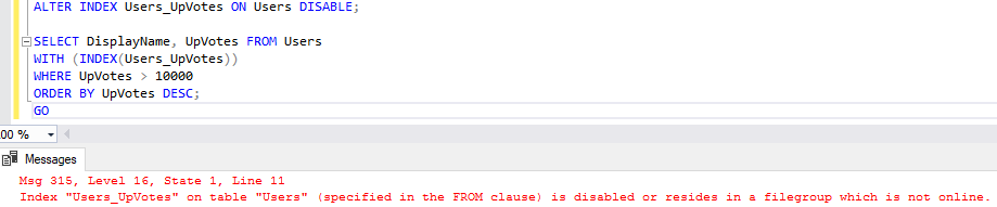 Our query is looking for the Users_UpVotes index and an error is getting thrown if that index can’t be used. If an index is referenced in a hint, it must be available. Index hints can be useful but should not be considered “set it and forget it” fixes.