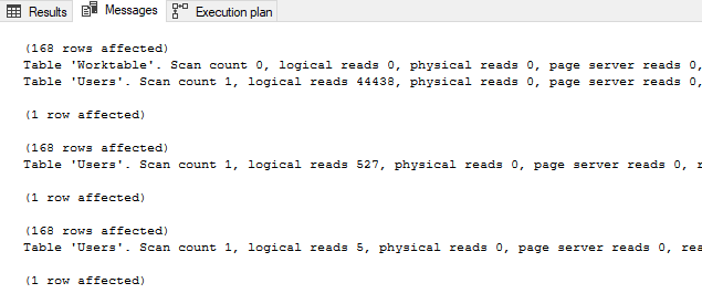 If you’re creating multiple indexes trying to find what is most efficient, index hints can be helpful to quickly compare and contrast. If we set statistics IO on and stick with our previous example, we can run the following which will force the use of each index: