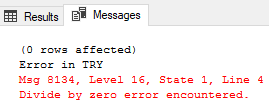 Let’s start with a basic TRY/CATCH that will cause an error based on dividing by zero:
