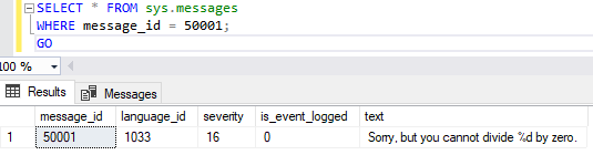 Let’s look at the same type of message but using THROW. Unlike THROW does not work with substitution parameters the same way as RAISERROR. That means we’ll want to add a custom message to sys.messages and use the FORMATMESSAGE function. To add the message we’ll run:
