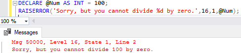 RAISERROR('Sorry, but you cannot divide %d by zero.',16,1,@Num);