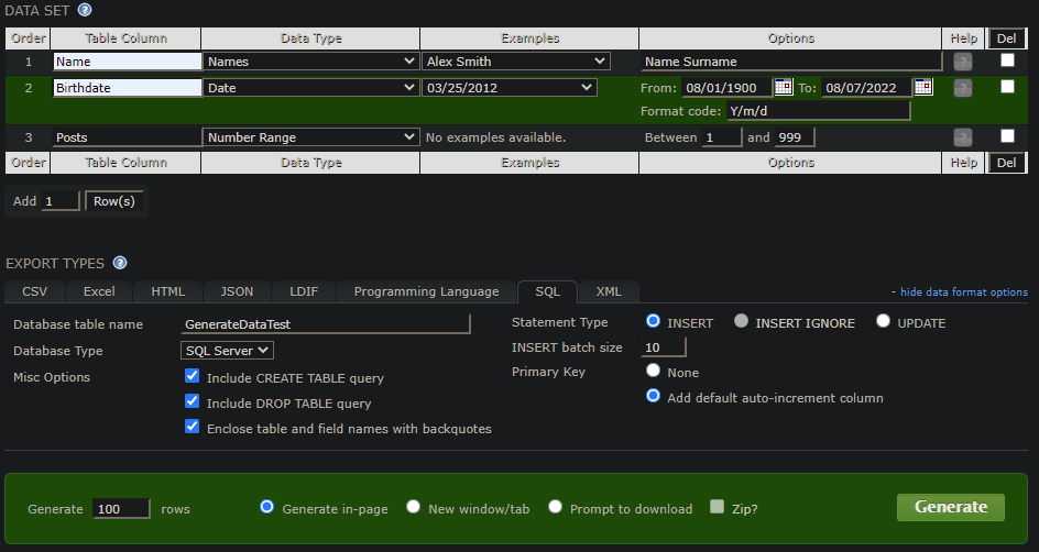 We can setup our table name, data types, and examples of how we want the data to look. After configuring our export settings at the bottom, we can click the generate button to view our script: