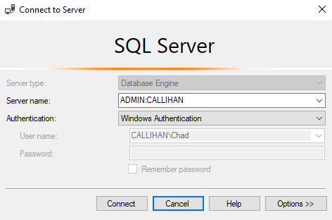 Now that we have the DAC enabled, let’s take a look at how to take advantage of this connection. You can login with SSMS (which we’ll focus on in this post) or SQLCMD. To login with the DAC in SSMS, you’ll want to add ADMIN to your server name. For my CALLIHAN server that will be: