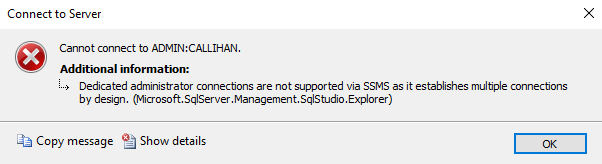 There’s a little more to the login than just adding ADMIN, though. You can expect to see the error below if you open up SSMS and try logging with ADMIN in your server name:
