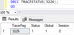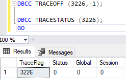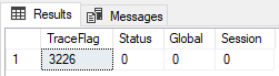 Based on the 0’s, We can see that trace flag 3226 is not enabled globally or for our current session. To check all trace flags enabled on your SQL Server you can run the same as above except substituting a trace flag with -1;