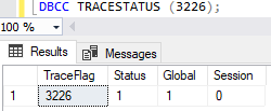 We’ve specified the trace flag and included -1 to set it globally. If we run the above statement to turn on trace flag 3226, we can check the status and confirm that it is now enabled: