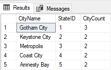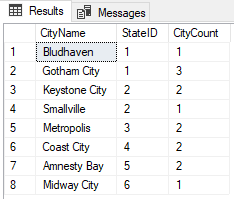 SELECT ROW_NUMBER() OVER(PARTITION BY CityName,StateID ORDER BY CityID) AS RowNbr