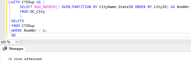 It’s time to clean up our table and get back to one record per city. We can accomplish this task by using a CTE, assigning row numbers, and deleting where the row number is greater than 1.