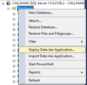 What if we want to use our DACPAC to create a new database using SSMS? Our first step will be to right click on Databases and select Deploy Data-tier Application.
