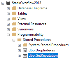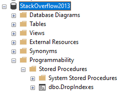 Before applying our DACPAC to the existing StackOverflow2013 database, let’s confirm that StackOverflow2013 does not have our new stored procedure and index.