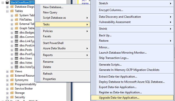 We’ll right click on our database, hover over Tasks, and click Upgrade Data-tier Application.