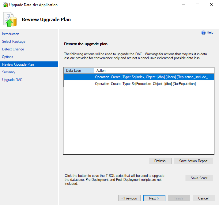 We have an index to be created and a stored procedure to be created. Our plan looks good. Time to click Next on the Review window and Next again on the Summary to start the upgrade.
