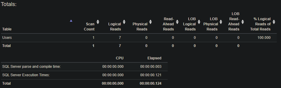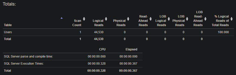 Without the index we were scanning the PK_Users_Id clustered index to return 921 of 4807 rows: