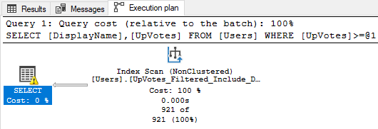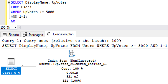 If the UpVotes count in the query can vary, we may want to add an index for the entire table. In our scenario, we only need where UpVotes is >= 5000. We can create a filtered index by adding a WHERE clause to the index creation script: