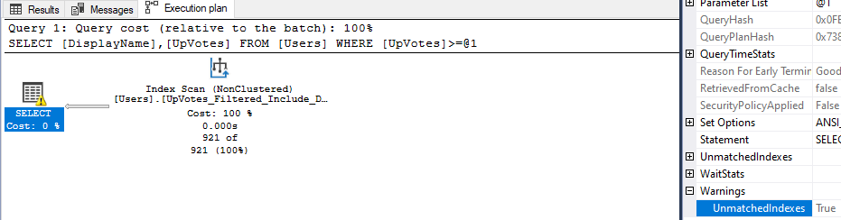 We have a warning for UnmatchedIndexes. SQL Server is telling us that a filtered index could not be used because of a parameterized query. That seems odd since our query isn’t parameterized. Also, our filtered index was successfully used.